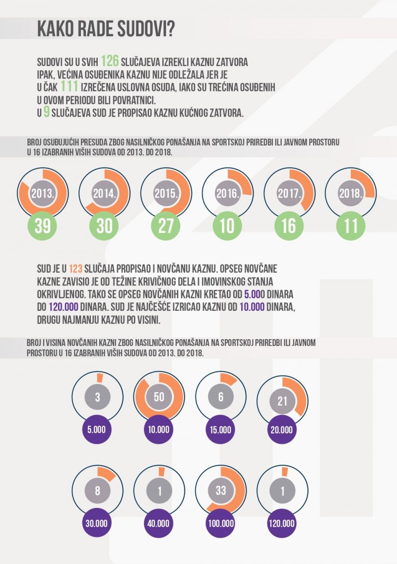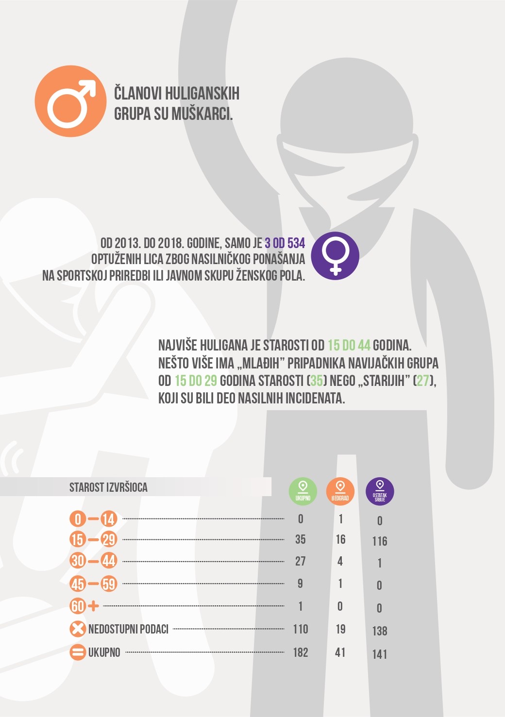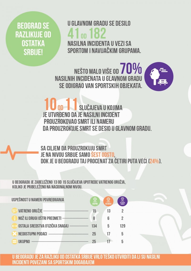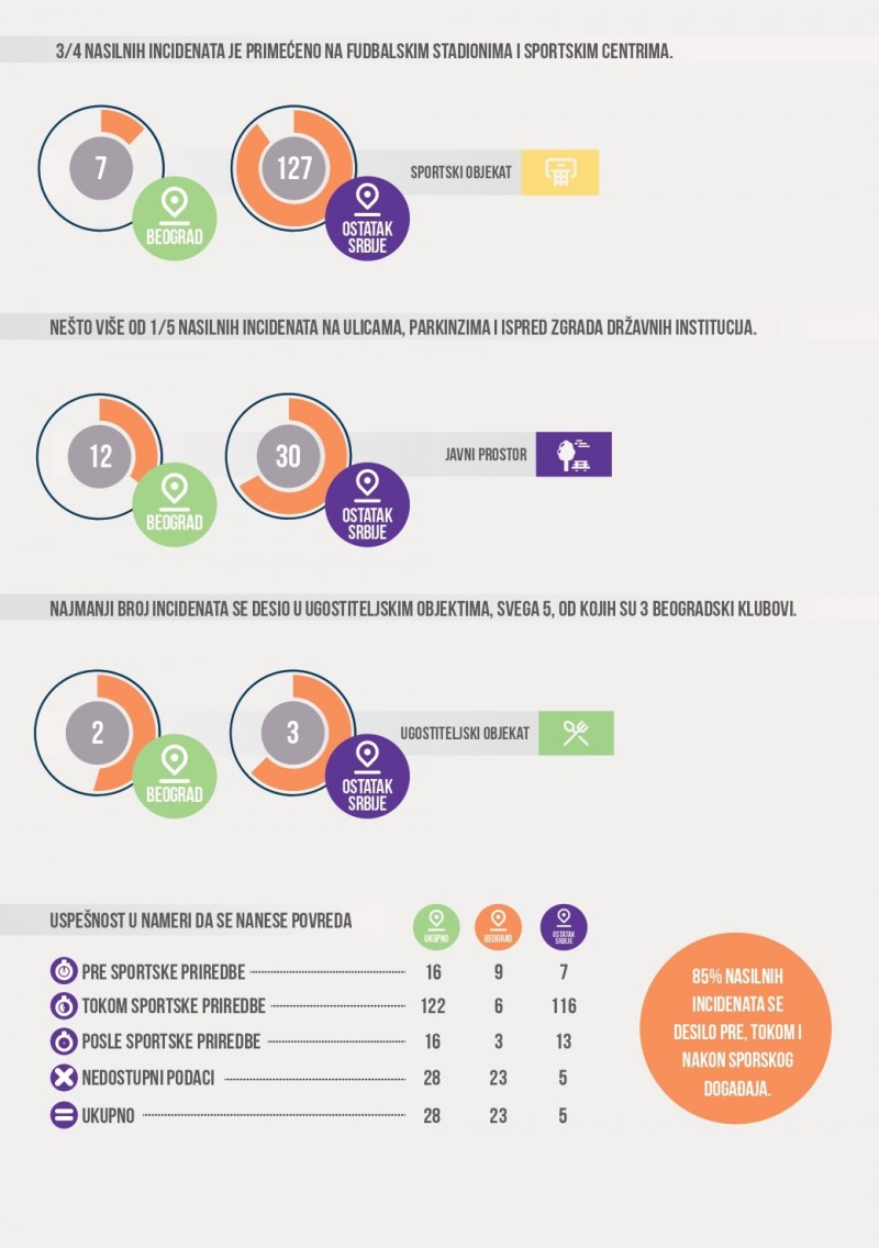 Identifikovano je 182 nasilna incidenta u vezi sa sportskim događajem i huliganskim grupama za vreme važenja Nacionalne strategije za borbu protiv nasilja i nedolicnog ponašanja na sportskim priredbama od 2013. do 2018. godine, na osnovu analize medijskog izveštavanja i sudske prakse. Najviše u Beogradu.