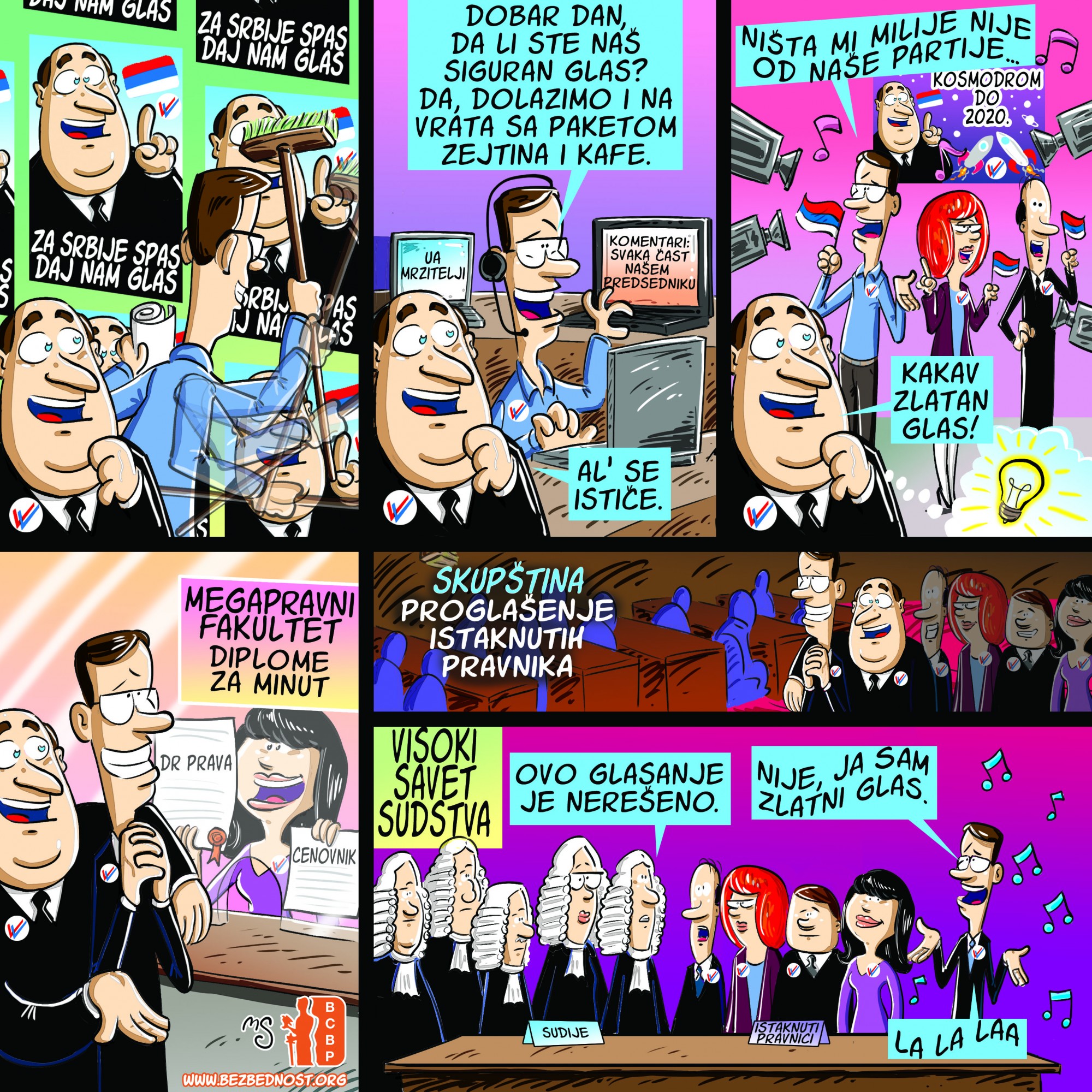 Novi strip BCBP skreće pažnju javnosti na predloge izmena Ustava kojima se predviđa da Visoki savet sudstva (VSS) čini 10 članova, pri čemu su njih 5 "istaknuti pravnici" koje bira Skupština, prema nejasnim kriterijumima. Sporan je i predlog da "zlatni glas" u odlučivanju pripada predsedniku VSS koji bi dolazio iz redova "istaknutih pravnika".
