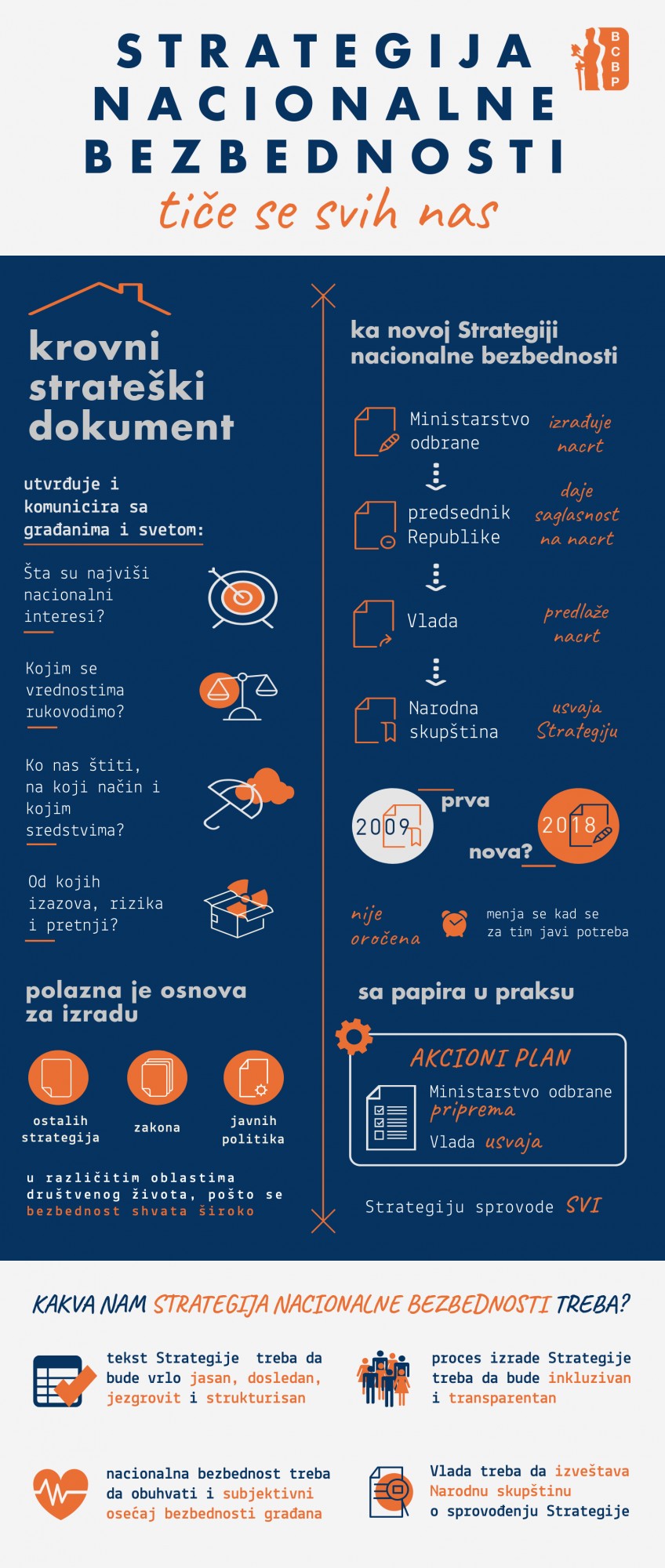 Novi infografik koji je pripremila istraživačica BCBP Jelena Pejić prikazuje koji je značaj Strategije nacionalne bezbednosti, na koji način se ona i prateći dokumenti usvajaju i kakva nam je strategija neophodna.