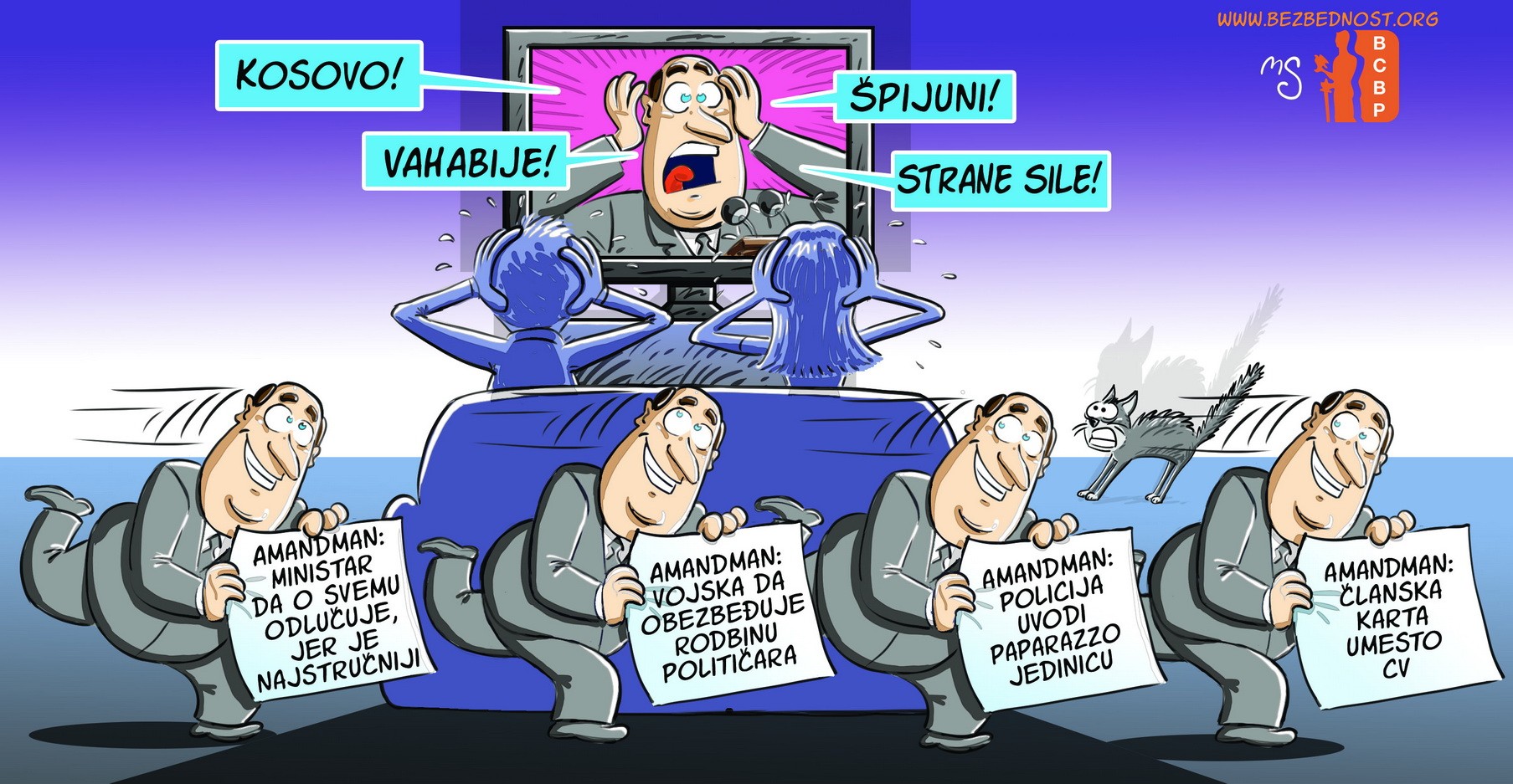 BCBP stripom skreće pažnju javnosti na predloge zakona i izmene i dopune zakona koji su se krajem 2017. godine nalazili u proceduri Narodne skupštine, a u kojima se nalaze brojne odredbe kojima se stanje vraća unazad u pogledu civilne i demokratske kontrole nad radom vojske, policije i službi bezbednosti.