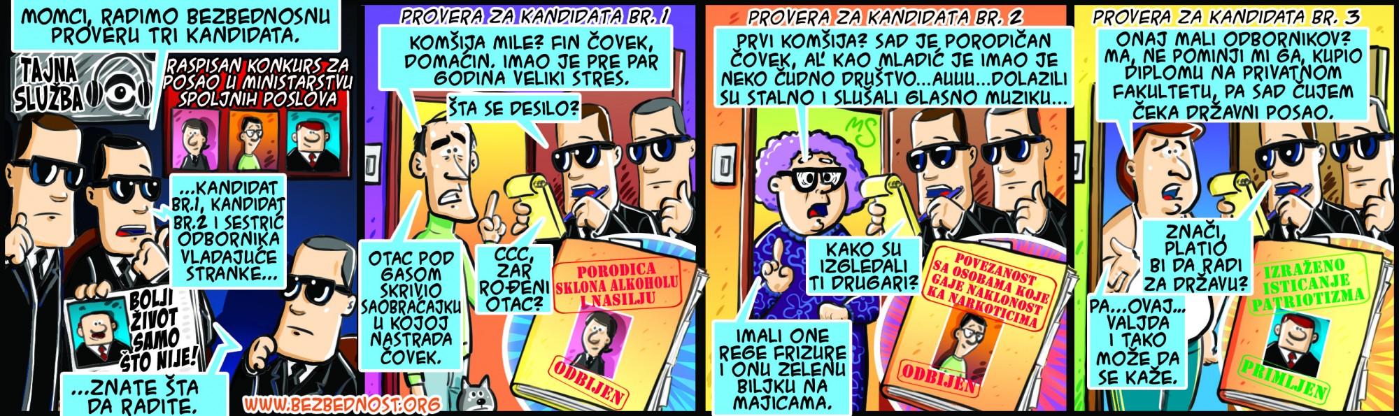 BCBP novim stripom skreće pažnju zašto bi građanima trebalo da je stalo do toga da se mere tajnog prikupljanja podatak primenjuju na zakonit i pravilan način. Bezbednosne provere prilikom zapošljavanja u državnoj službi su jedan od takvih primera.